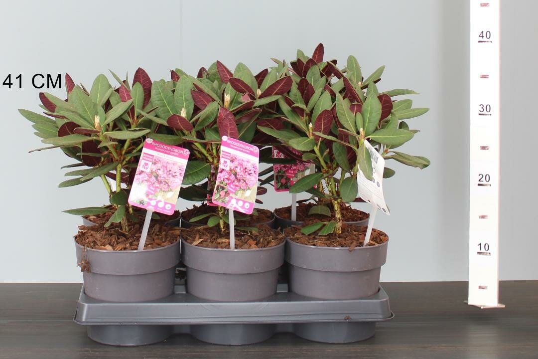 100-125 cm magasra növő örökzöld cserje. A levelek alsó oldala egész évben vörös színű.b Tavasszal rengeteg, rózsaszín virágot hoz. Árnyékos helyet és savanyú talajt kedvel.
