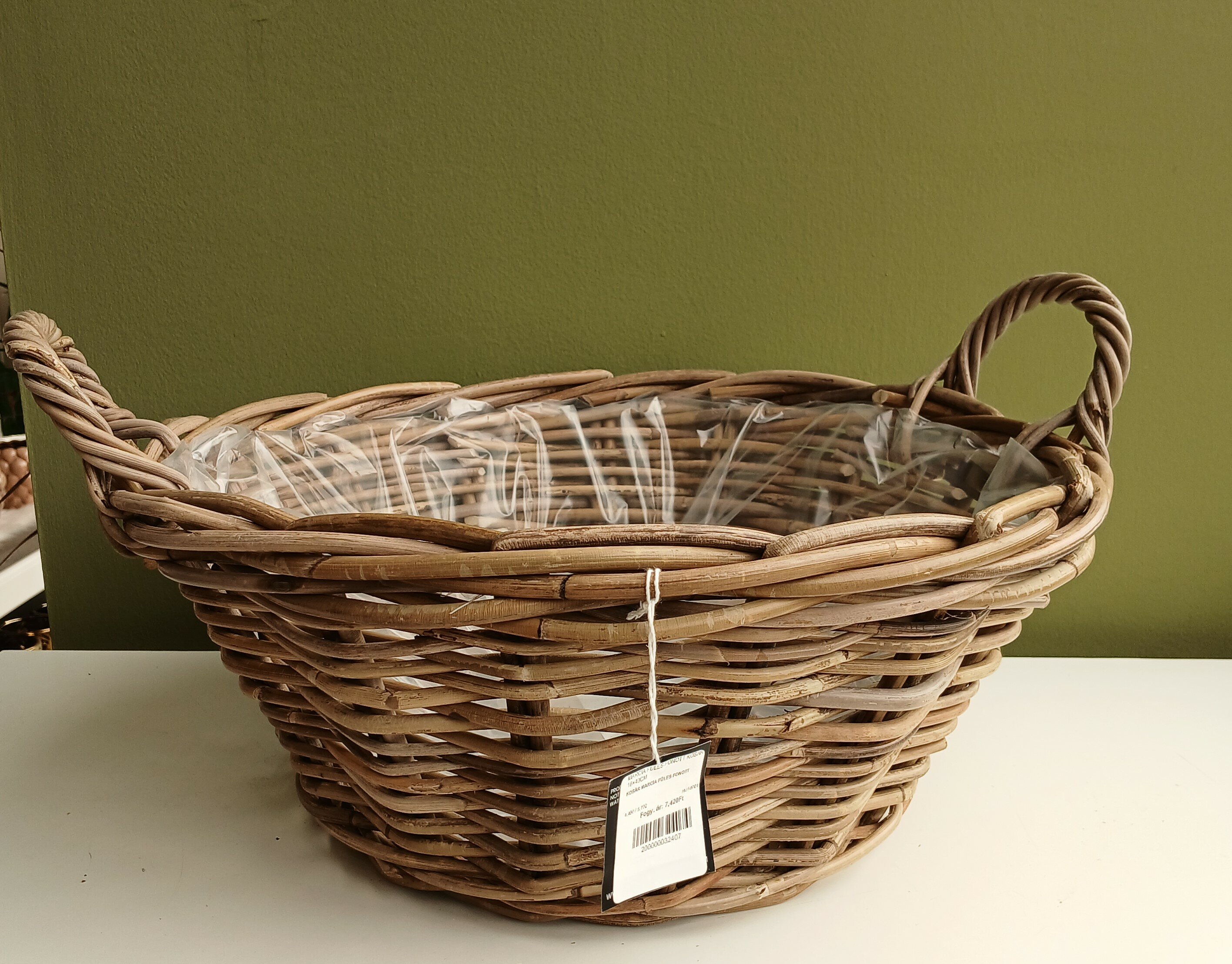 Bélelt, fonott füles kosár.