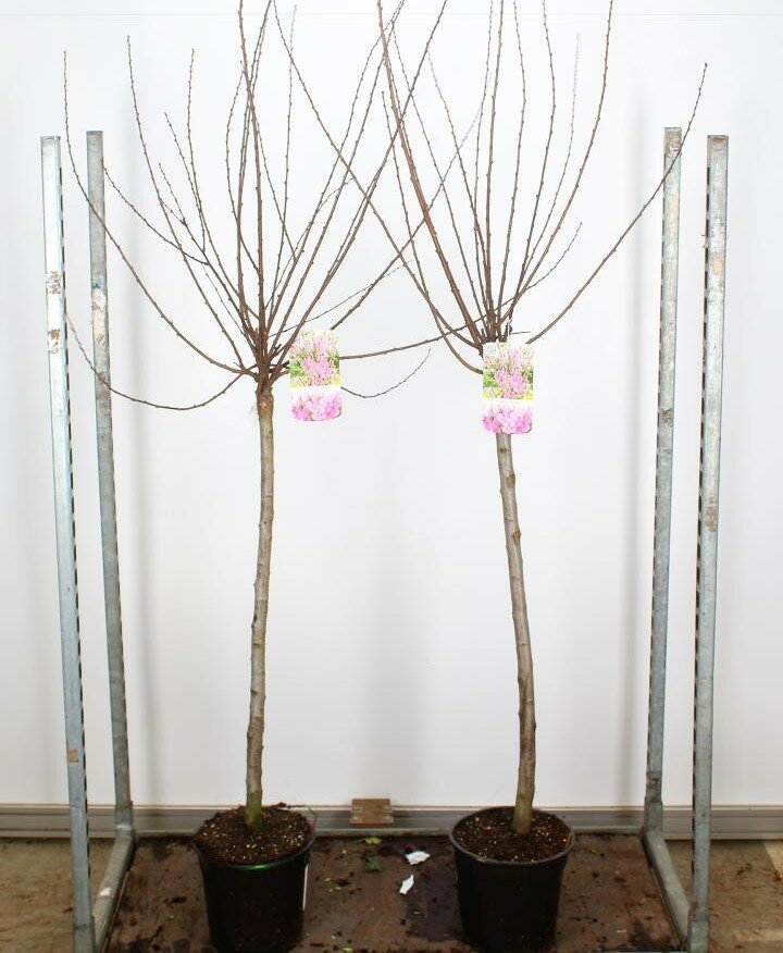 1,5-2 m magasra növő, lombhullató cserje, 120 cm-es törzsön. Rózsaszín virágait áprilisban hozza a vesszők teljes hosszában. Napos fekvést, jó vízelvezetésű talajt igényel.